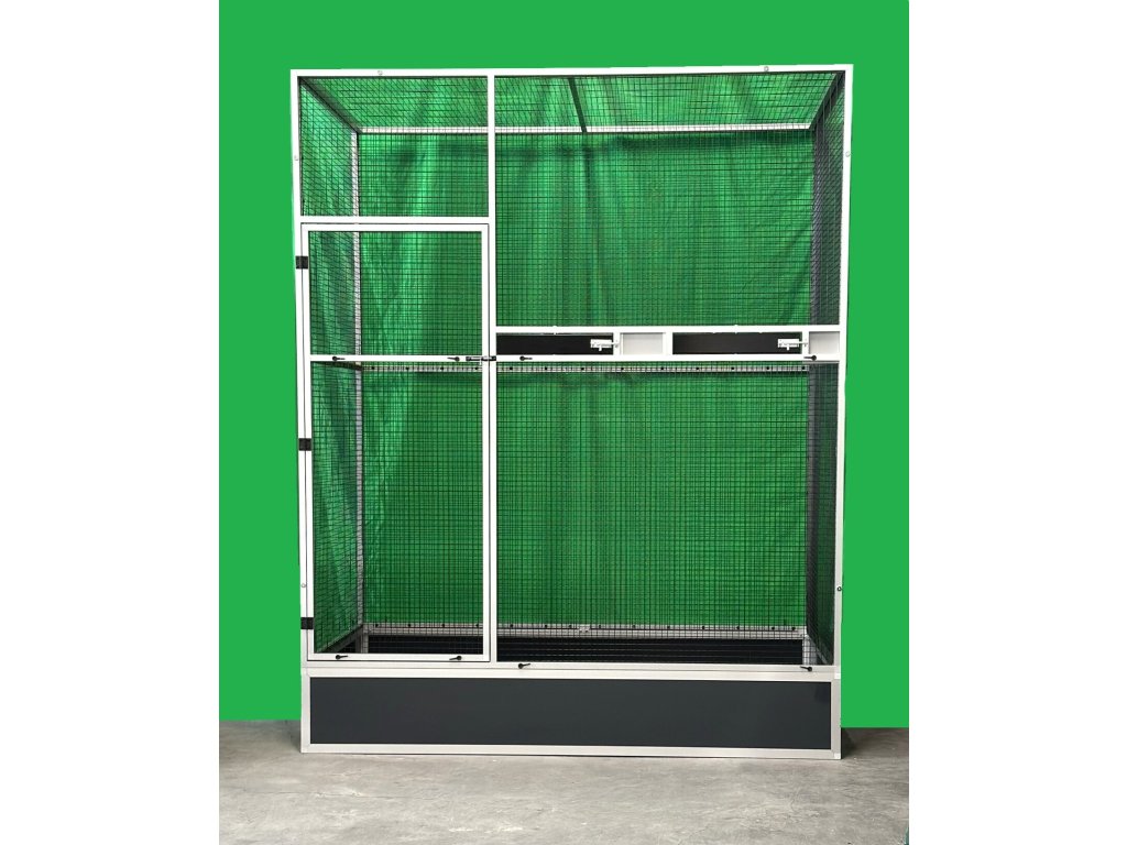 Konstrukcja woliery jest wykonana z anodowanego profilu w kolorze srebrnym i pokryta włoską siatką w czarnym matowym kolorze, co umożliwia lepszy widok na zwierzę umieszczone wewnątrz woliery.