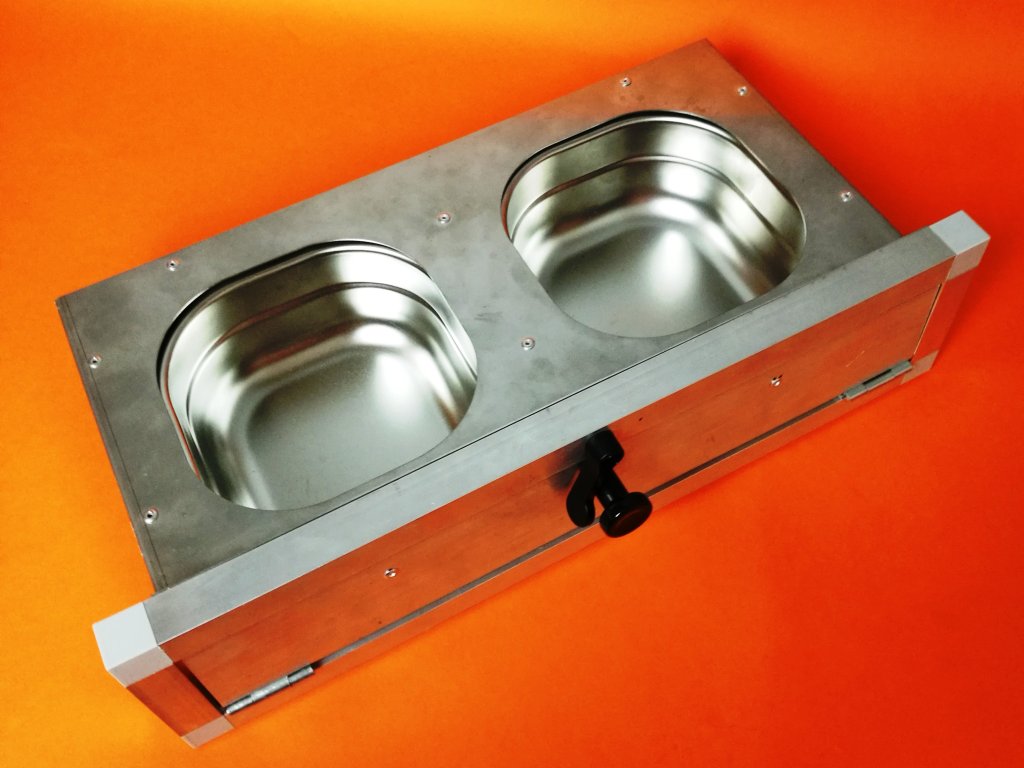 Wysuwane stoły do karmienia z pojemnikami gastronomicznymi to tylko potwierdzają. Gastro pojemniki nie są odpowiednie dla drobnych ptaków ze względu na swoją głębokość 60 mm. Siła blachy nierdzewnej użytej na płytę główną wynosi 1 mm. Możliwość łączenia z innymi pulpitami wtykowymi, a także z pulpitami obrotowymi, oferuje hodowcy dużą możliwość spełnienia swoich wyobrażeń, jak najlepiej zapewnić obsługę swojego urządzenia hodowlanego. Wysuwane i obrotowe stoły do karmienia (z wyjątkiem stołu do karmienia dla ar) mają wysokość łącznie z ramką 11 cm. Karmnik jest dostarczany w stanie złożonym, w tym z ramką. Rama jest wykonana z aluminiowego profilu 20x20x1,5mm. Jeśli klient zdecyduje się na wbudowanie stołu do karmienia bezpośrednio w konstrukcję woliery, najlepiej jest zamówić stół do karmienia i ramkę osobno. W ramce można łatwo wymienić łączniki i wbudować ladę bezpośrednio w konstrukcję.