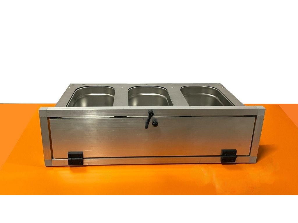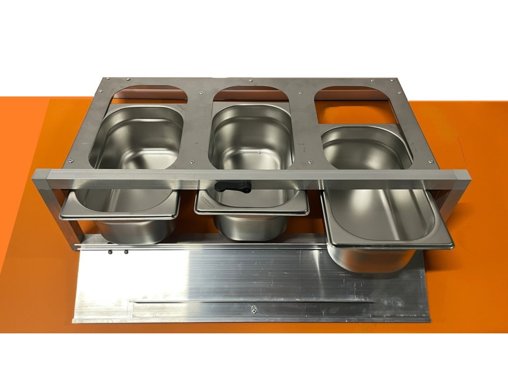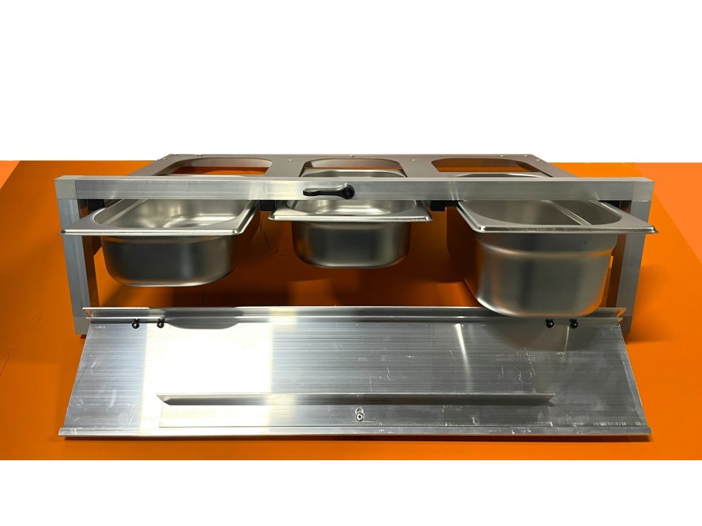 Stół paszowy ze stali nierdzewnej, w tym nierdzewne pojemniki gastronomiczne.