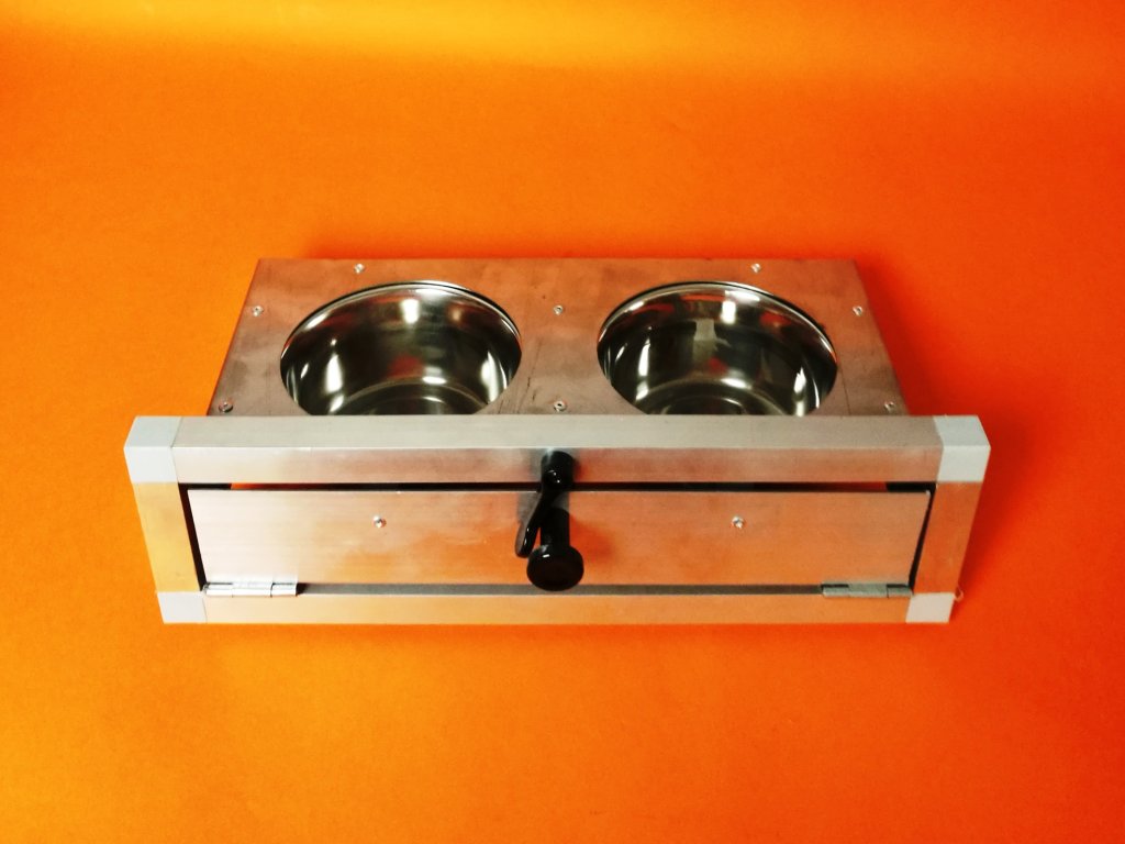 Siła blachy nierdzewnej użytej na płytę główną wynosi 1 mm. Możliwość łączenia z innymi pulpitami wtykowymi, a także z pulpitami obrotowymi, oferuje hodowcy dużą możliwość spełnienia swoich wyobrażeń, jak najlepiej zapewnić obsługę swojego urządzenia hodowlanego. Wysuwane i obrotowe stoły do karmienia (z wyjątkiem stołu do karmienia dla ar) mają wysokość łącznie z ramką 11 cm. Karmnik jest dostarczany w stanie złożonym, w tym z ramką. Rama jest wykonana z aluminiowego profilu 20x20x1,5mm. Jeśli klient zdecyduje się na wbudowanie stołu do karmienia bezpośrednio w konstrukcję woliery, najlepiej jest zamówić stół do karmienia i ramkę osobno. W ramce można łatwo wymienić łączniki i wbudować ladę bezpośrednio w konstrukcję.