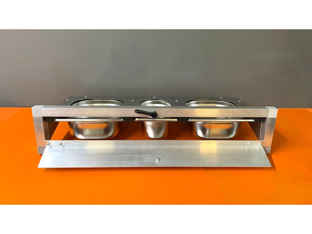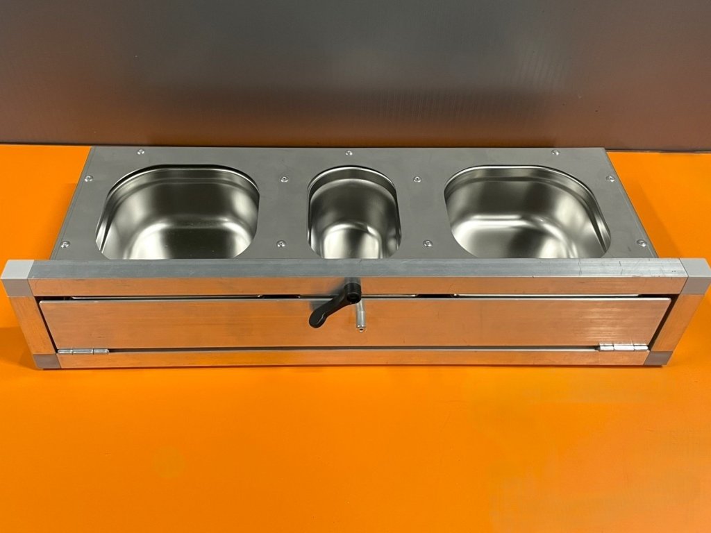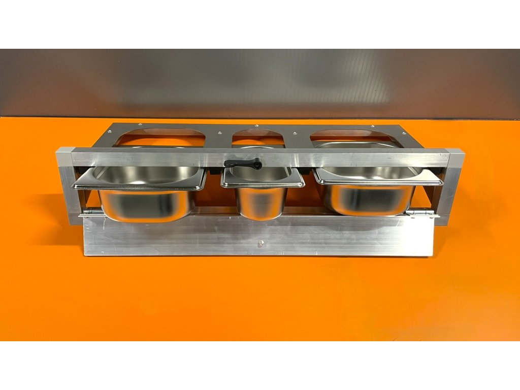 Stół paszowy ze stali nierdzewnej, w tym nierdzewne pojemniki gastronomiczne.