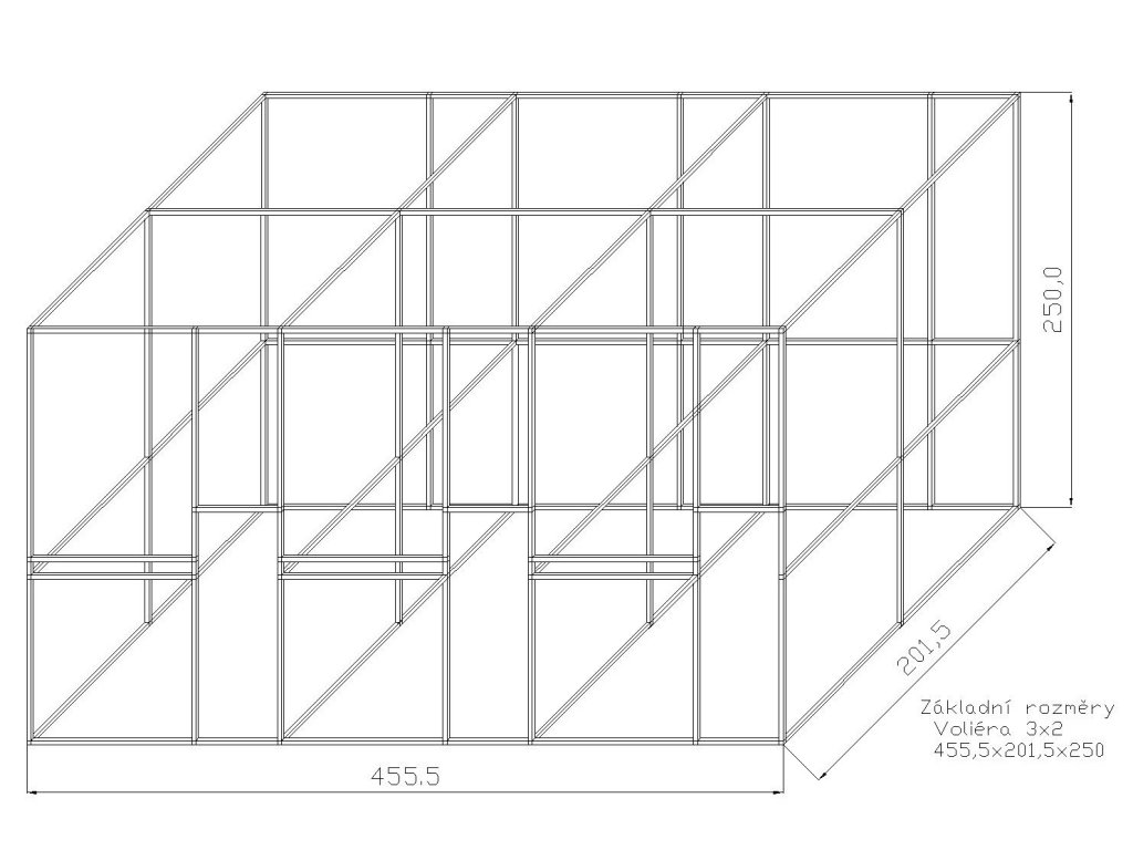 Szerokość jednego boksu wynosi około 153 cm. Konstrukcja po złożeniu tworzy jedną całość. Na życzenie możemy dostarczyć za dopłatą konstrukcję również w srebrnym anodowanym wykonaniu, gdzie cena konstrukcji wzrośnie o ok. 13%. Części zestawu to drzwiczki do woliery, zawiasy i zasuwka. Wymiary samych drzwiczek to: wysokość 134 cm, szerokość 48 cm. Częścią zestawu jest również stalowy stół do karmienia, gdzie klient ma do wyboru trzy typy KPG05, KPG07, KPG11. Zawsze są to wsuwane stalowe stoły paszowe z pojemnikami gastronomicznymi. Gastro pojemniki mają wysokość 6 cm. Pojedynczy stół paszowy KPG 11 oferuje również możliwość wymiany misek na płytsze. Miejsce 6 cm na 4 cm. Wybrany typ należy podać w uwagach. Te stoły paszowe w porównaniu do obrotowych stołów paszowych mają kilka zalet. Naczynia z karmnika nie można wyciągnąć zwierzęciem wewnątrz woliery. Przed karmnikiem można umieścić żerdź. Czego nie umożliwia obrotowy stół paszowy. Naczynia ze względu na swój eliptyczny kształt i głębokość mają większą pojemność niż okrągłe miski. Siatka i materiały mocujące nie są częścią zestawu.Odpowiednie użycie siatki to marka Esafort o długości 52m.