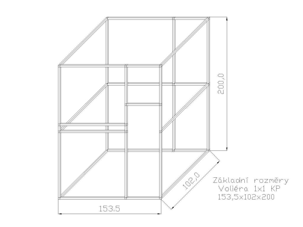 Szerokość jednego boksu wynosi około 153 cm. Konstrukcja po złożeniu tworzy jedną całość. Na życzenie możemy dostarczyć za dopłatą konstrukcję również w srebrnym anodowanym wykonaniu, gdzie cena konstrukcji wzrośnie o ok. 13%. Części zestawu to drzwiczki do woliery, zawiasy i zasuwka. Wymiary samych drzwiczek to: wysokość 134 cm, szerokość 48 cm. Częścią zestawu jest również stalowy stół do karmienia, gdzie klient ma do wyboru trzy typy KPG05, KPG07, KPG11. Zawsze są to wsuwane stalowe stoły paszowe z pojemnikami gastronomicznymi. Gastro pojemniki mają wysokość 6 cm. Pojedynczy stół paszowy KPG 11 oferuje również możliwość wymiany misek na płytsze. Miejsce 6 cm na 4 cm. Wybrany typ należy podać w uwagach. Te stoły paszowe w porównaniu do obrotowych stołów paszowych mają kilka zalet. Naczynia z karmnika nie można wyciągnąć zwierzęciem wewnątrz woliery. Przed karmnikiem można umieścić żerdź. Czego nie umożliwia obrotowy stół paszowy. Naczynia ze względu na swój eliptyczny kształt i głębokość mają większą pojemność niż okrągłe miski. Siatka i materiały mocujące nie są częścią zestawu.