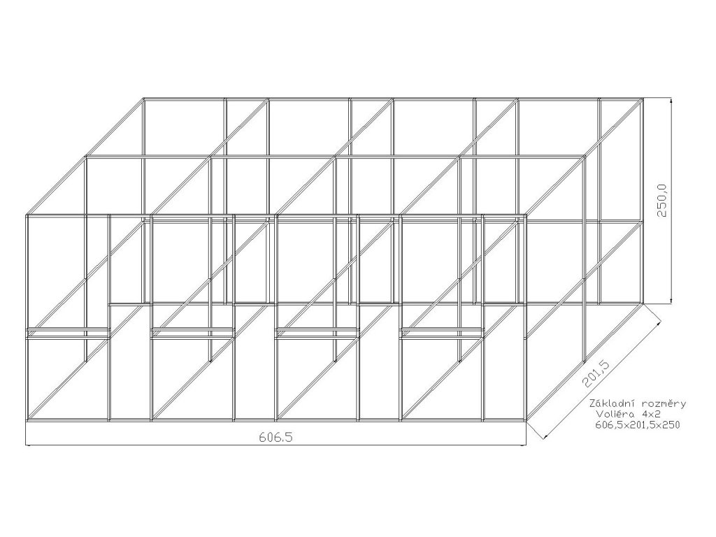 Szerokość jednego boksu wynosi około 153 cm. Konstrukcja po złożeniu tworzy jedną całość. Na życzenie możemy dostarczyć za dopłatą konstrukcję również w srebrnym anodowanym wykonaniu, gdzie cena konstrukcji wzrośnie o ok. 13%. Części zestawu to drzwiczki do woliery, zawiasy i zasuwka. Wymiary samych drzwiczek to: wysokość 134 cm, szerokość 48 cm. Częścią zestawu jest również stalowy stół do karmienia, gdzie klient ma do wyboru trzy typy KPG05, KPG07, KPG11. Zawsze są to wsuwane stalowe stoły paszowe z pojemnikami gastronomicznymi. Gastro pojemniki mają wysokość 6 cm. Pojedynczy stół paszowy KPG 11 oferuje również możliwość wymiany misek na płytsze. Miejsce 6 cm na 4 cm. Wybrany typ należy podać w uwagach. Te stoły paszowe w porównaniu do obrotowych stołów paszowych mają kilka zalet. Naczynia z karmnika nie można wyciągnąć zwierzęciem wewnątrz woliery. Przed karmnikiem można umieścić żerdź. Czego nie umożliwia obrotowy stół paszowy. Naczynia ze względu na swój eliptyczny kształt i głębokość mają większą pojemność niż okrągłe miski. Siatka i materiały mocujące nie są częścią zestawu.Odpowiednie użycie siatki to marka Esafort o długości 67m.