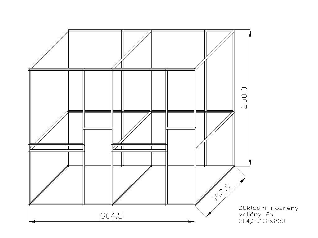 Szerokość jednego boksu wynosi około 153 cm. Konstrukcja po złożeniu tworzy jedną całość. Na życzenie możemy dostarczyć za dopłatą konstrukcję również w srebrnym anodowanym wykonaniu, gdzie cena konstrukcji wzrośnie o ok. 13%. Części zestawu to drzwiczki do woliery, zawiasy i zasuwka. Wymiary samych drzwiczek to: wysokość 134 cm, szerokość 48 cm. Częścią zestawu jest również stalowy stół do karmienia, gdzie klient ma do wyboru trzy typy KPG05, KPG07, KPG11. Zawsze są to wsuwane stalowe stoły paszowe z pojemnikami gastronomicznymi. Gastro pojemniki mają wysokość 6 cm. Pojedynczy stół paszowy KPG 11 oferuje również możliwość wymiany misek na płytsze. Miejsce 6 cm na 4 cm. Wybrany typ należy podać w uwagach. Te stoły paszowe w porównaniu do obrotowych stołów paszowych mają kilka zalet. Naczynia z karmnika nie można wyciągnąć zwierzęciem wewnątrz woliery. Przed karmnikiem można umieścić żerdź. Czego nie umożliwia obrotowy stół paszowy. Naczynia ze względu na swój eliptyczny kształt i głębokość mają większą pojemność niż okrągłe miski. Siatka i materiały mocujące nie są częścią zestawu.Odpowiednie użycie siatki to marka Esafort o długości 24m.